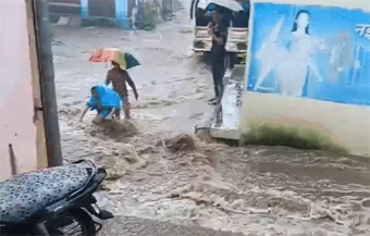 विदिशा जिले के ग्यारसपुर में पॉलिथीन ओढ़ी एक बच्ची अपने भाई के साथ स्कूल वैन का इंतजार कर रही थी। तभी कॉलोनी में पानी का तेज बहाव आया और बच्ची बह गई। उसे बचाने उसका भाई दौड़ा, लेकिन वह भी बहने लगा। बच्ची लोडिंग वाहन के नीचे से बहते हुए चौराहे तक पहुंच गई और चीखती रही। चौराहे पर खड़े लोगों ने समय रहते उसे पकड़ लिया और सुरक्षित बाहर निकाला।